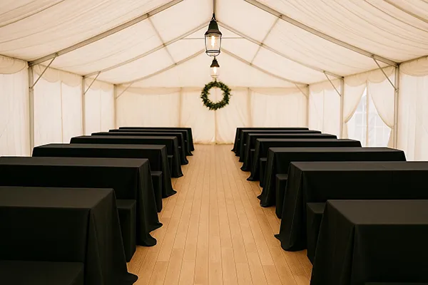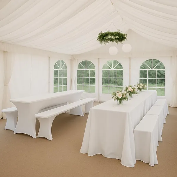 Damit es auch optisch perfekt passt, kannst du auf Wunsch unsere hochwertigen Hussen dazubuchen – bodentief und in klassischem Stretch-Design. So verleihst du deiner Feier im Handumdrehen einen eleganten Look.